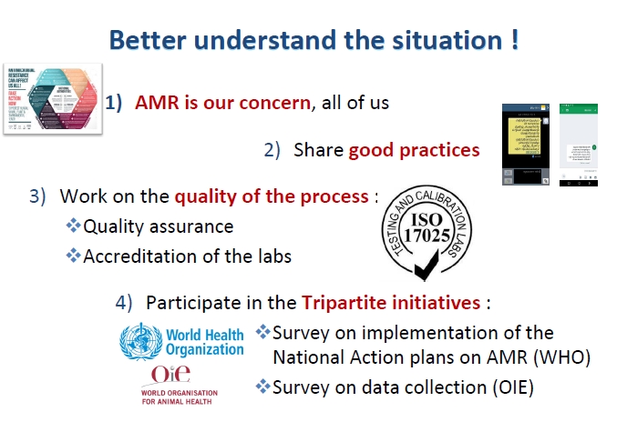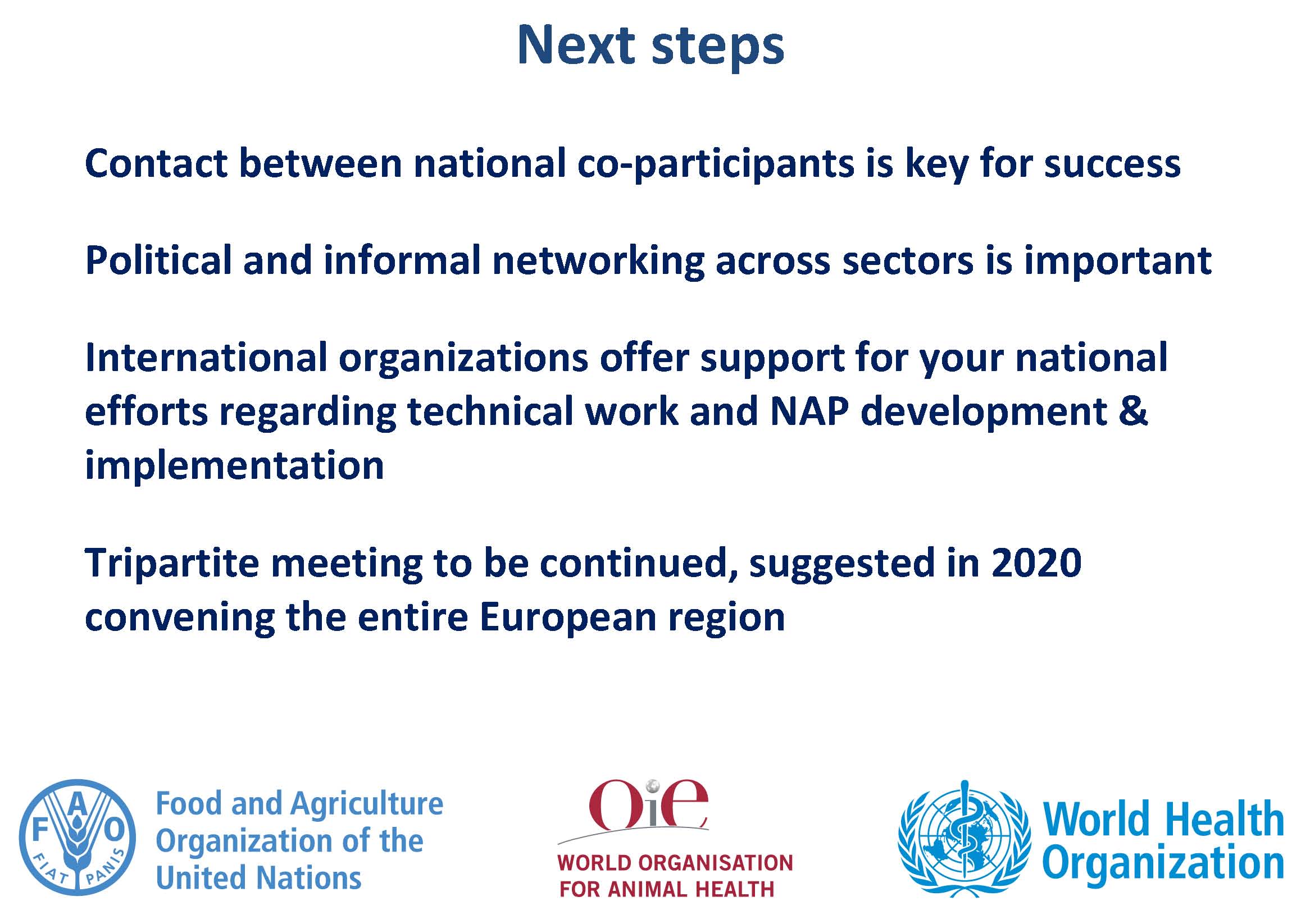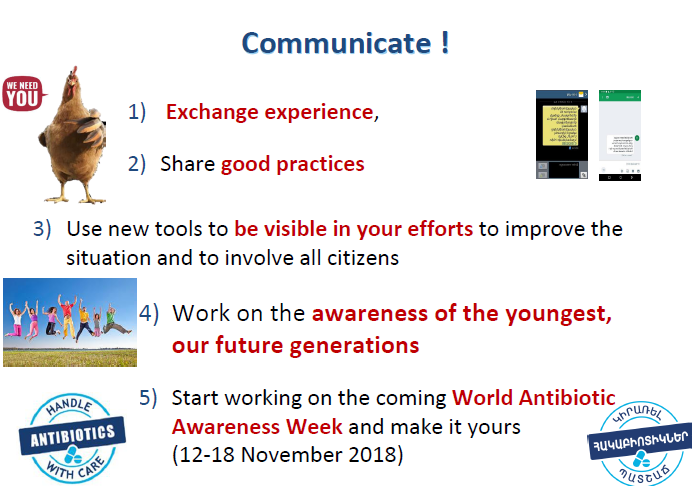 Detailed information regarding the AMR Global Action Plan from a tripartite perspective, results of the last survey on the development and implementation of NAP-AMR in Europe and all tripartite communication tools regarding AMR and World Antibiotic Awareness Week 2018 were presented to the participants.
