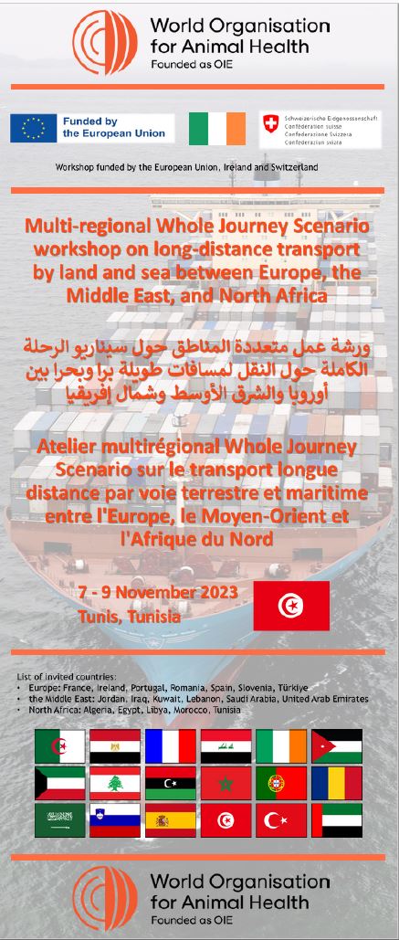 The Multi-regional Whole Journey Scenario (WJS) Workshop on long-distance transport by land and sea between Europe, the Middle East and North Africa was held in Tunis, Tunisia, between the 07 – 09 November 2023, with the joint forces by the WOAH Sub-Regional Representations in Brussels and Tunis and the Regional Representation Office in Beirut.