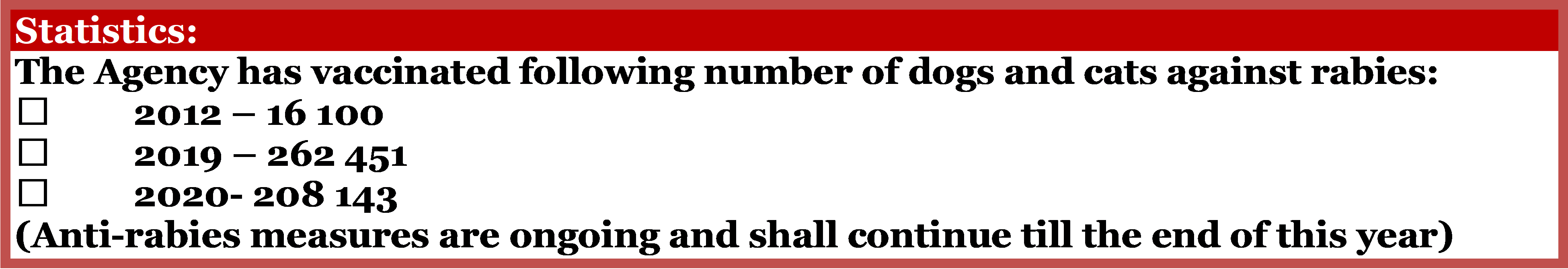 From 2006 till 2012 measures against rabies were administered only at the foci if the disease was identified. However, starting from 2013, the Agency has inaugurated a wide-scale prophylactic vaccination of pet animals (dogs and cats) free of charge.