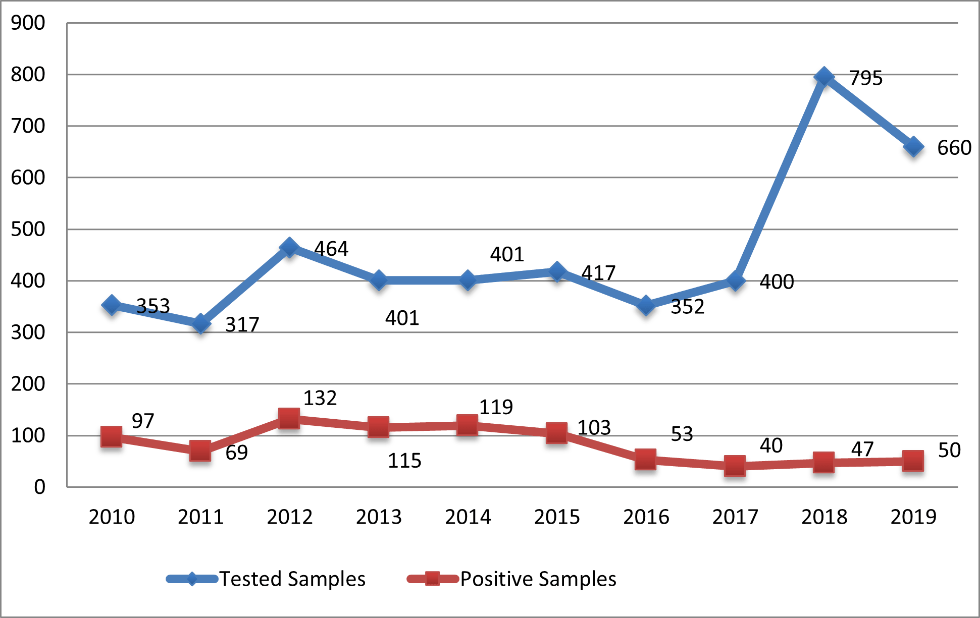 A notable area for the Agency’s activities is the permanent disease monitoring (study of post-vaccination monitoring and study of antibody level in vaccinated animals). Since 2015 samples taken from an average of 300 vaccinated animals are tested every year in line with pertinent testing patterns (the post-vaccinal immunity and antibody titres are higher than 90%).