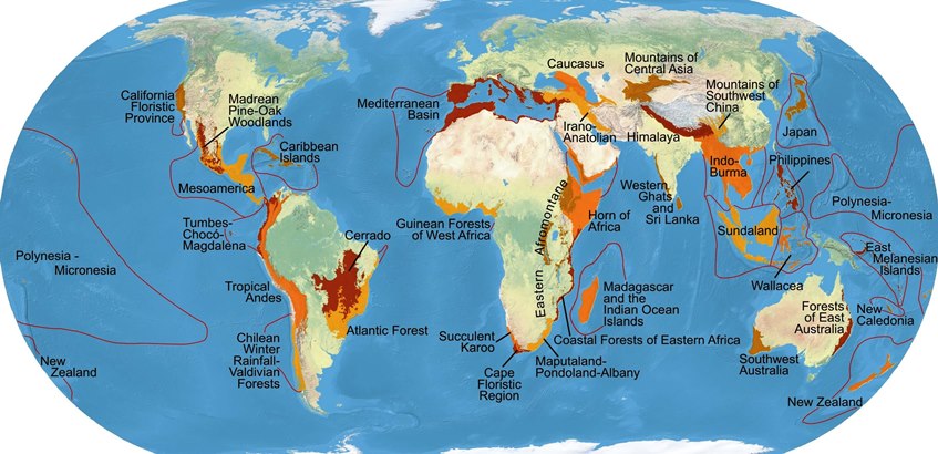 The Conservation International recognizes 36 biodiversity hotspots all over the world – regions, which represent approximately 2.5% of Earth’s land surface.