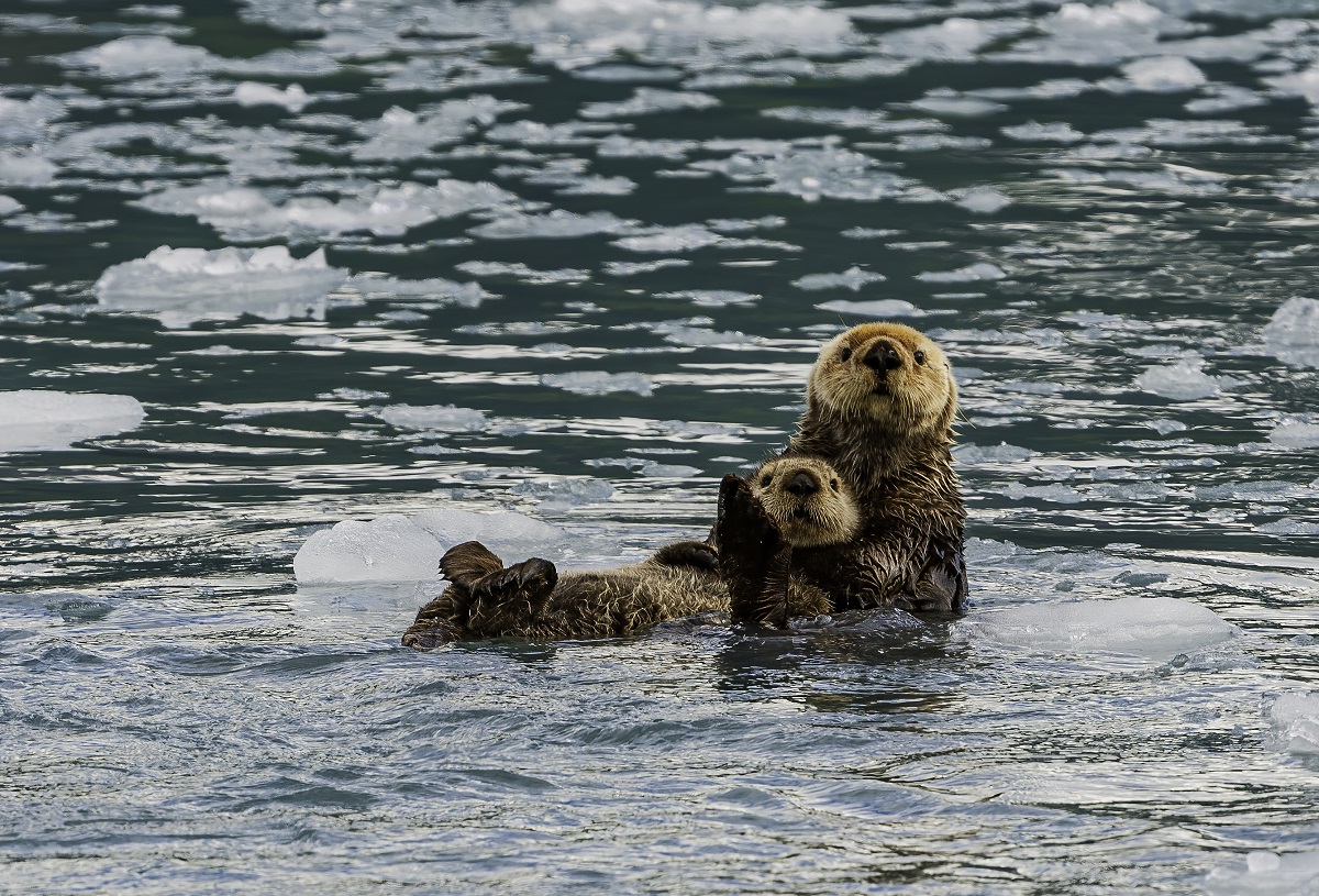 Mother and Young Alaska Sea Otter, Sea otter, Enhydra lutris, Prince William Sound, Alaska, cold water, near glaciers, ice from a glacier. resting; floating; mother; pup; young otter; swimming; holding pup. At Suprise Glacier in Prince William Sound;