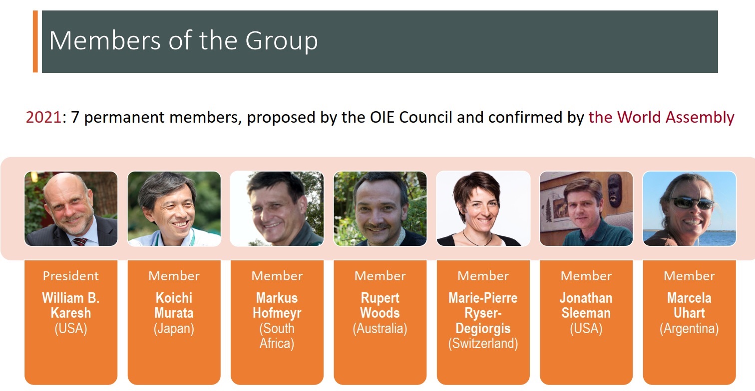 It meets once a year in person and several times during the year by teleconference. The Working Group reports to our Director General who will transmit the report, or relevant parts of it, to the appropriate Specialist Commissions of WOAH.