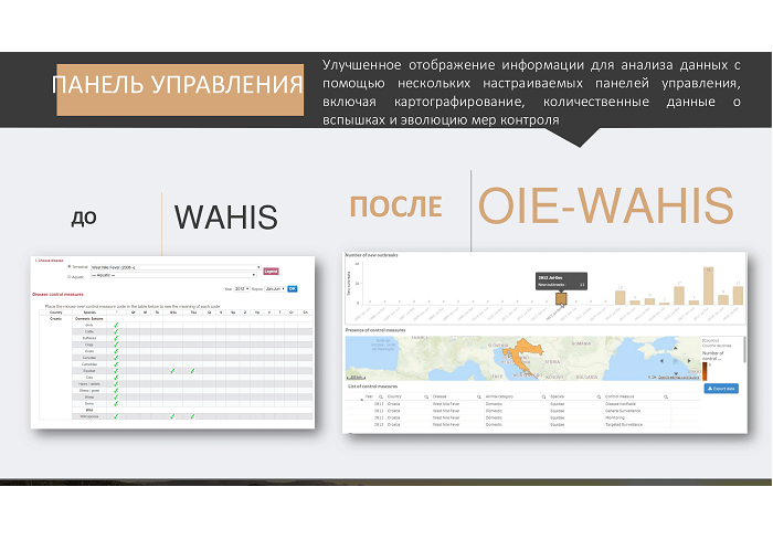 Поскольку болезни животных продолжают распространяться по всему миру, они также становятся бременем для мировой экономики и даже угрожают нарушить цепочки поставок продовольствия. По оценкам экспертов, около 20% производственных потерь во всем мире могут быть связаны с болезнями животных. Поддержание здоровья животных посредством отслеживания вспышек болезней и принятия соответствующих мер – имеет важное значение для защиты продовольственной безопасности и средств к существованию. Кроме того, за счет расширения использования, OIE-WAHIS еще больше повысит прозрачность в информации в отношении болезней. Таким образом, это будет способствовать безопасной и справедливой трансграничной торговле животными и продукцией животного происхождения, а также принятию решений на основе обоснованных рисков и фактов в отношении политики в области охраны здоровья животных и общественного здравоохранения. Благодаря более быстрому и подробному уведомлению о географической локализации вспышек и последующему их контролю торговые ограничения будут более целенаправленными.