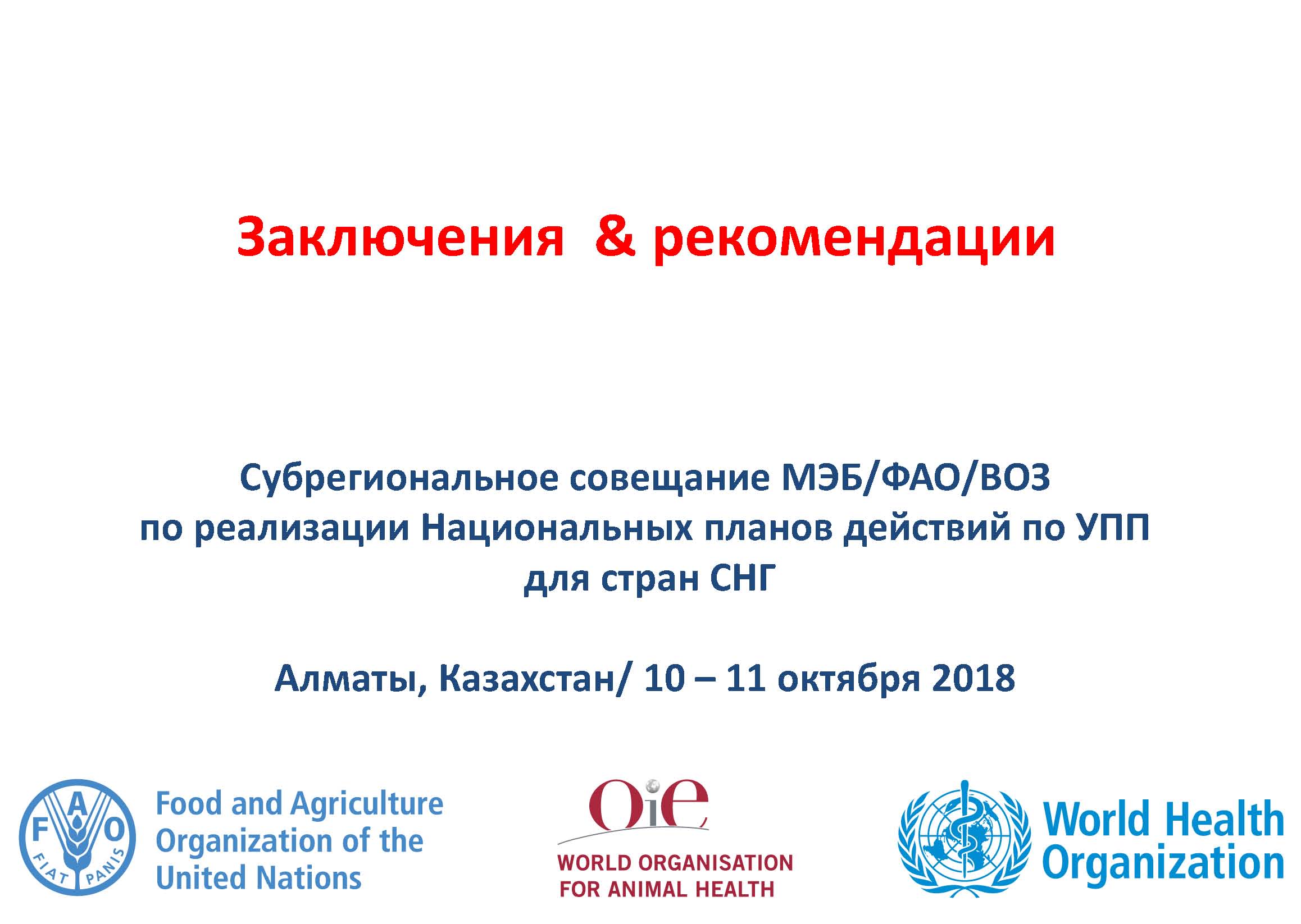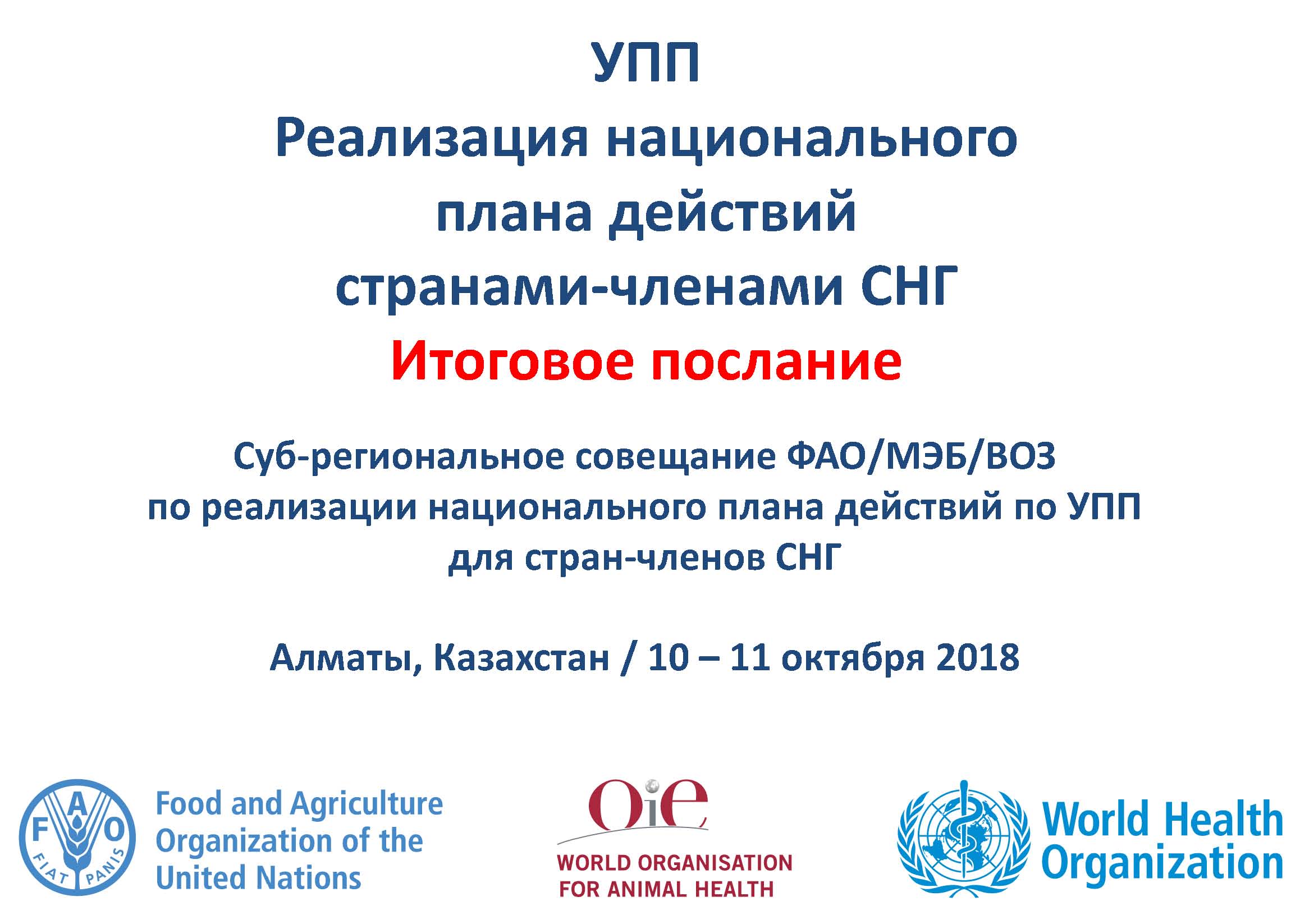 Во второй раз представители министерств здравоохранения и сельского хозяйства, ветеринарных служб и служб общественного здравоохранения собрались, чтобы обменяться мнениями о разработке Национального плана действий и мероприятий по борьбе с УПП во всех секторах (НПД-УПП). После первого мероприятия, в котором участвовали четыре страны Центральной Азии (Казахстан, Кыргызстан, Таджикистан и Узбекистан) в Бишкеке (Кыргызстан) в июне 2017 г., трехсторонний альянс продолжил оказывать поддержку странам в поддержании импульса и работе над завершением и реализацией НПД-УПП. Динамика была сохранена и распространена на более широкую аудиторию стран Евразии (Армения, Азербайджан, Беларусь, Грузия, Казахстан, Кыргызстан, Российская Федерация, Таджикистан, Туркменистан и Узбекистан).