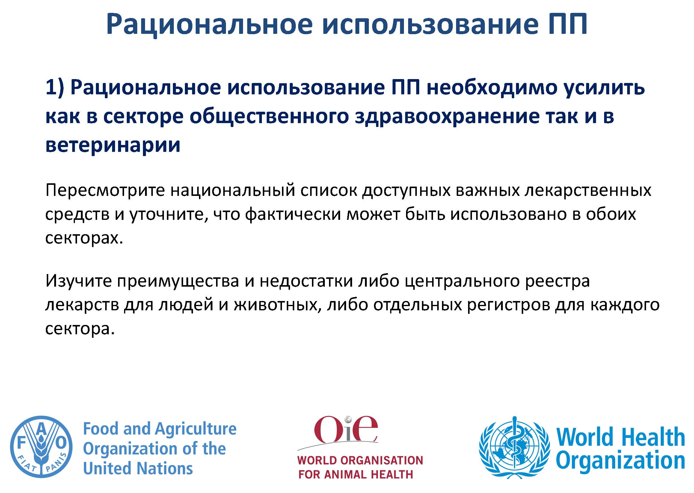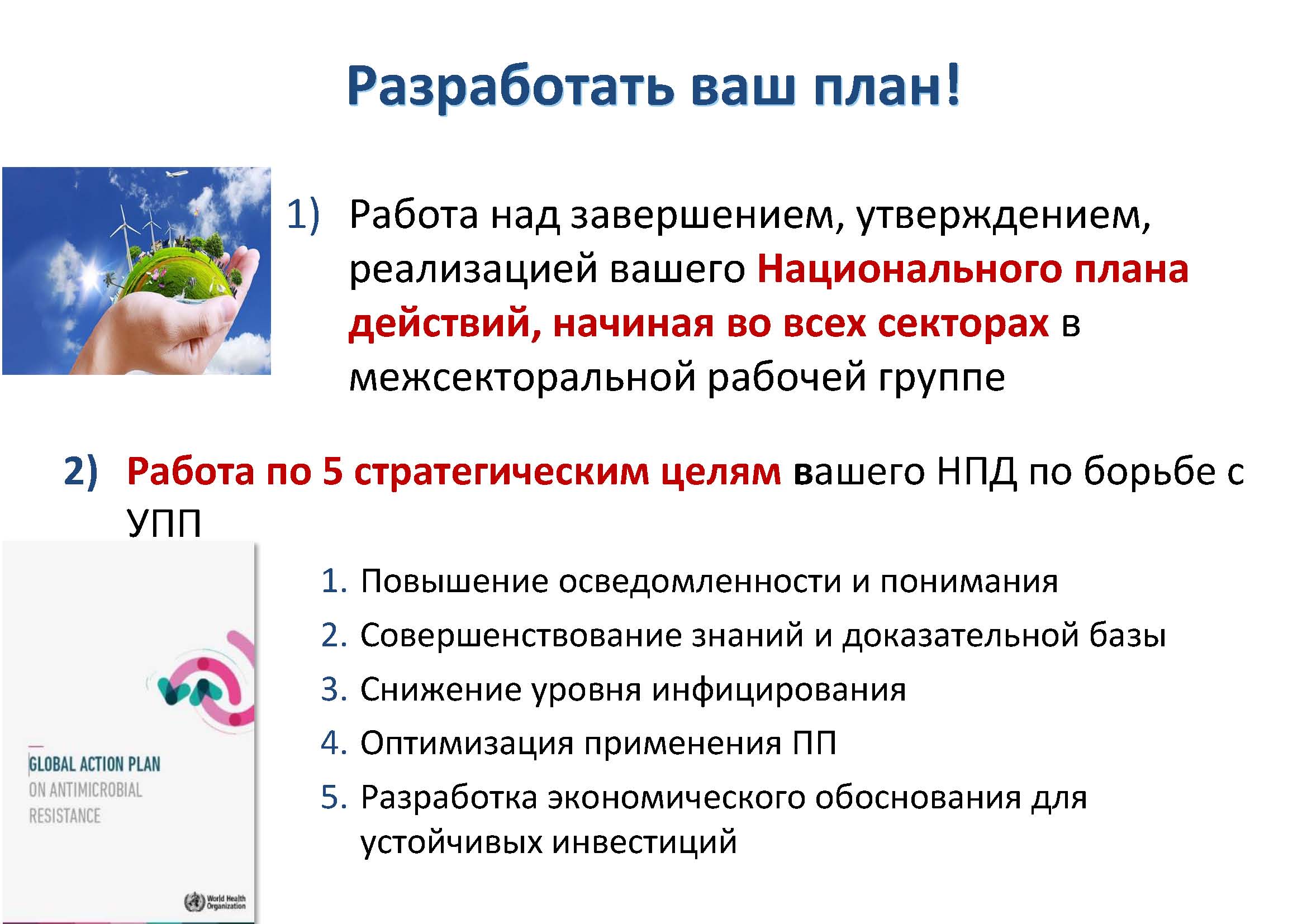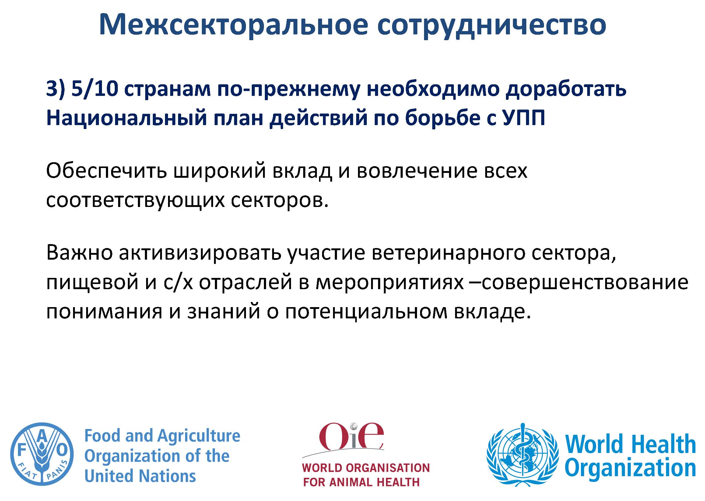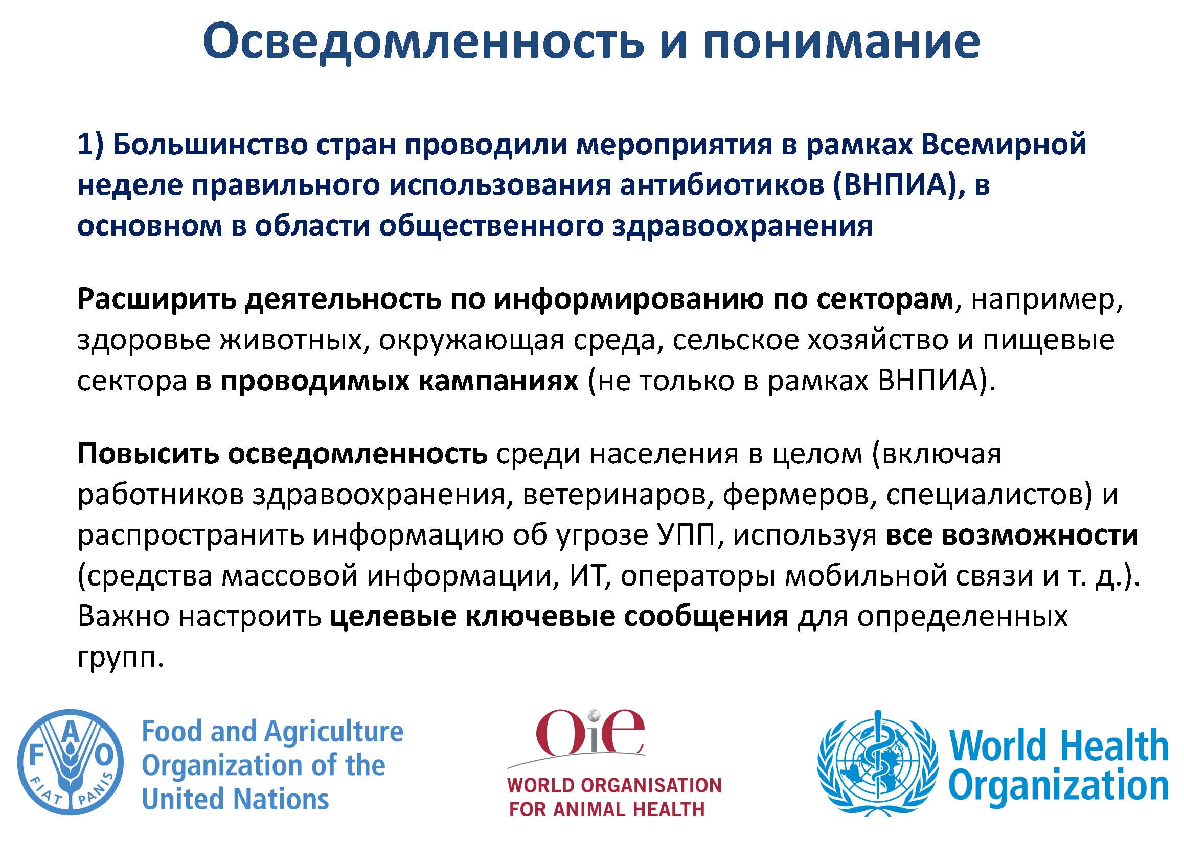 Повышение и расширение понимания и знаний об УПП требуется для привлечения национальных представителей секторов здравоохранения, сельского хозяйства и животноводства, а также для поощрения изменений в поведении. Реформы необходимы, но требуют устойчивого финансирования всех мероприятий, указанных в НПД.
