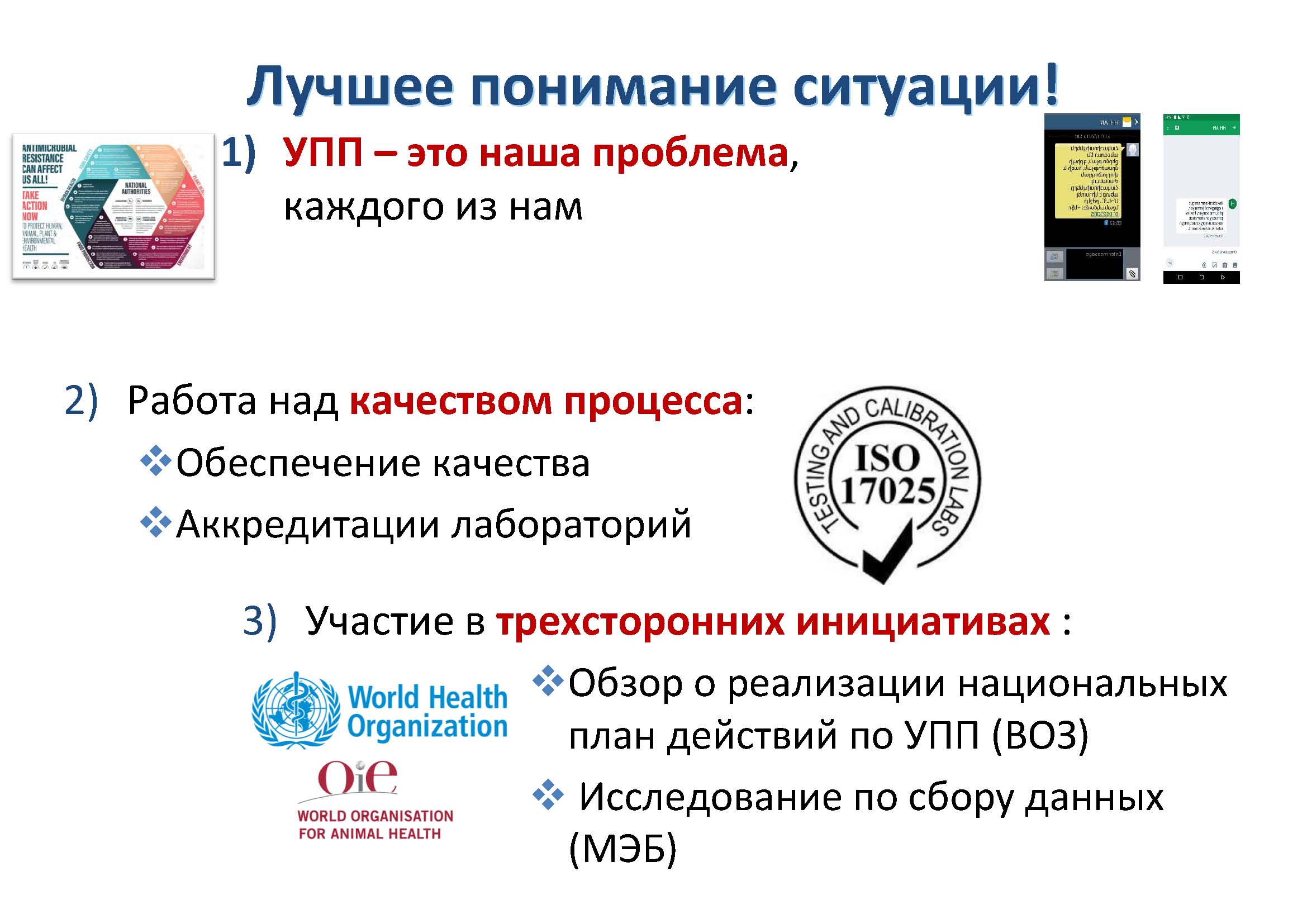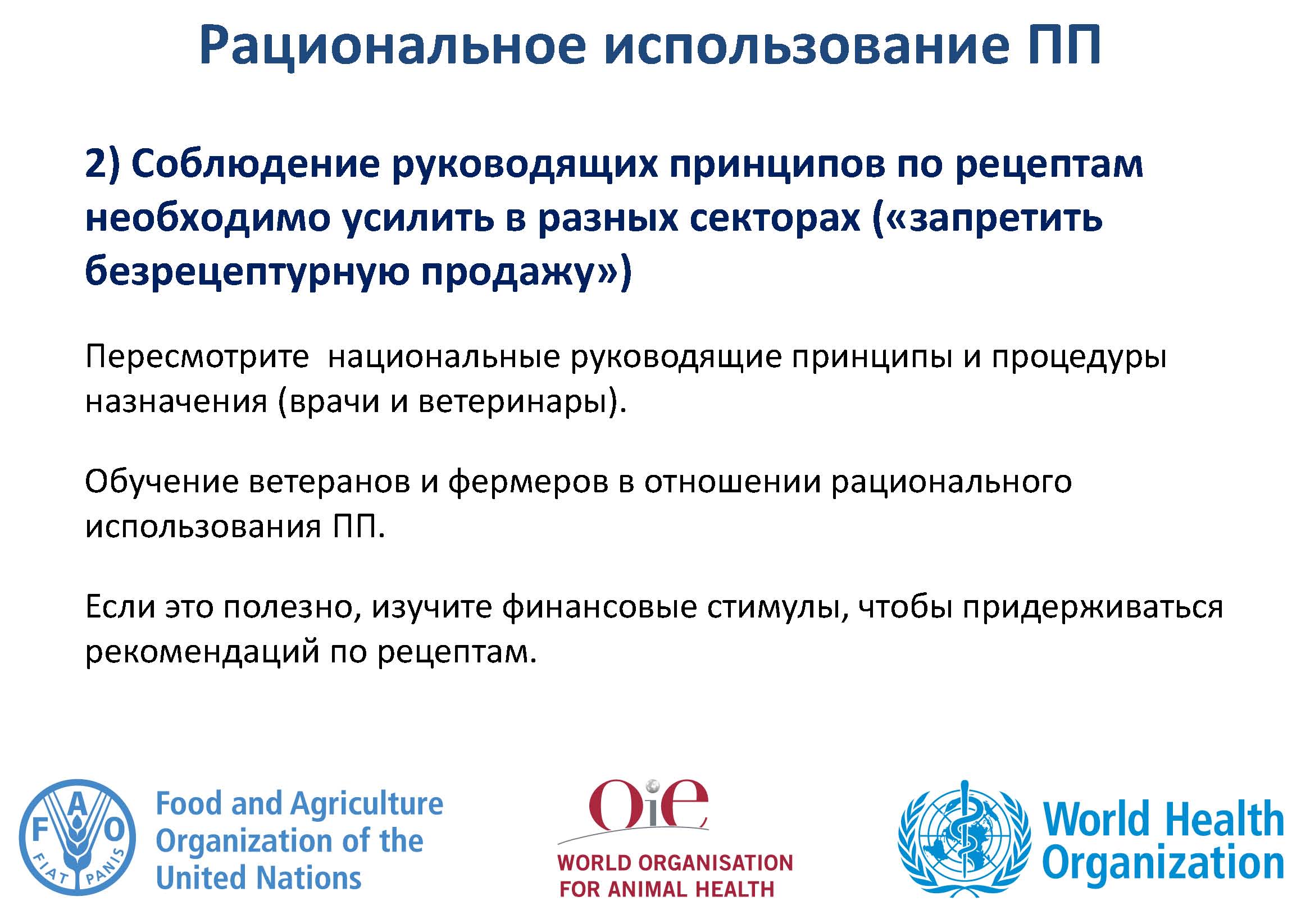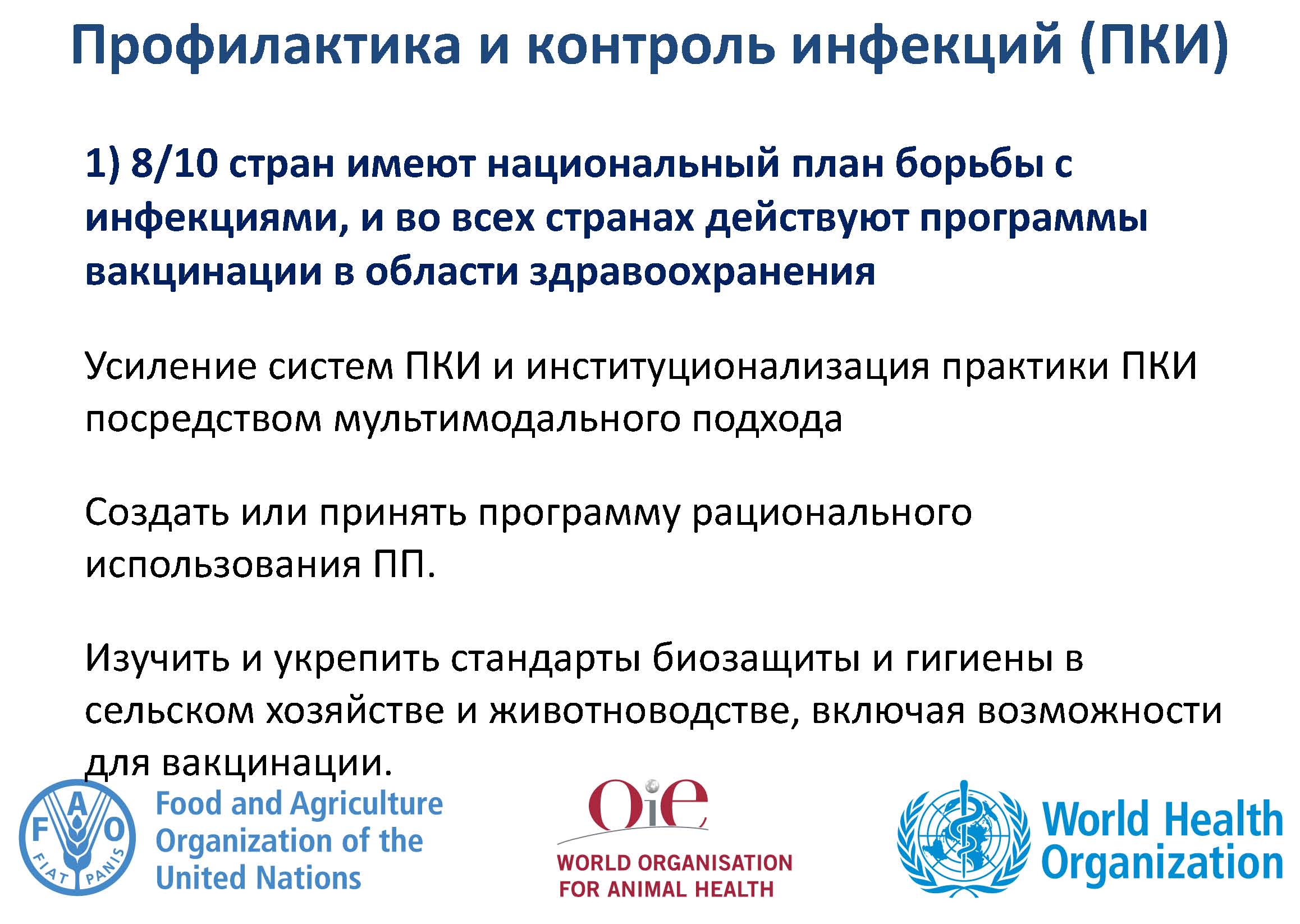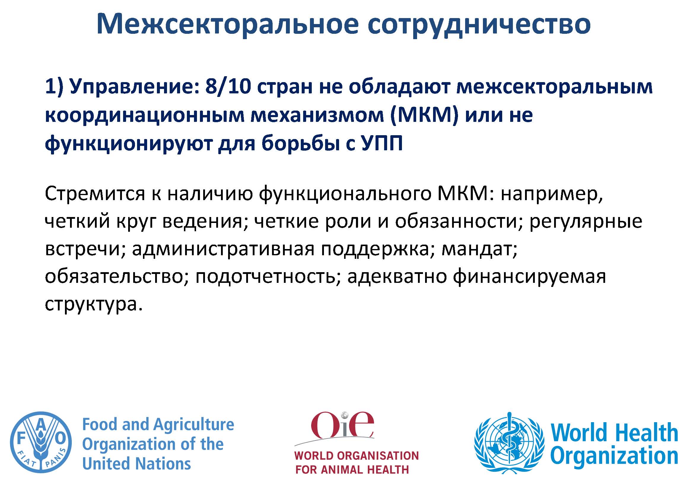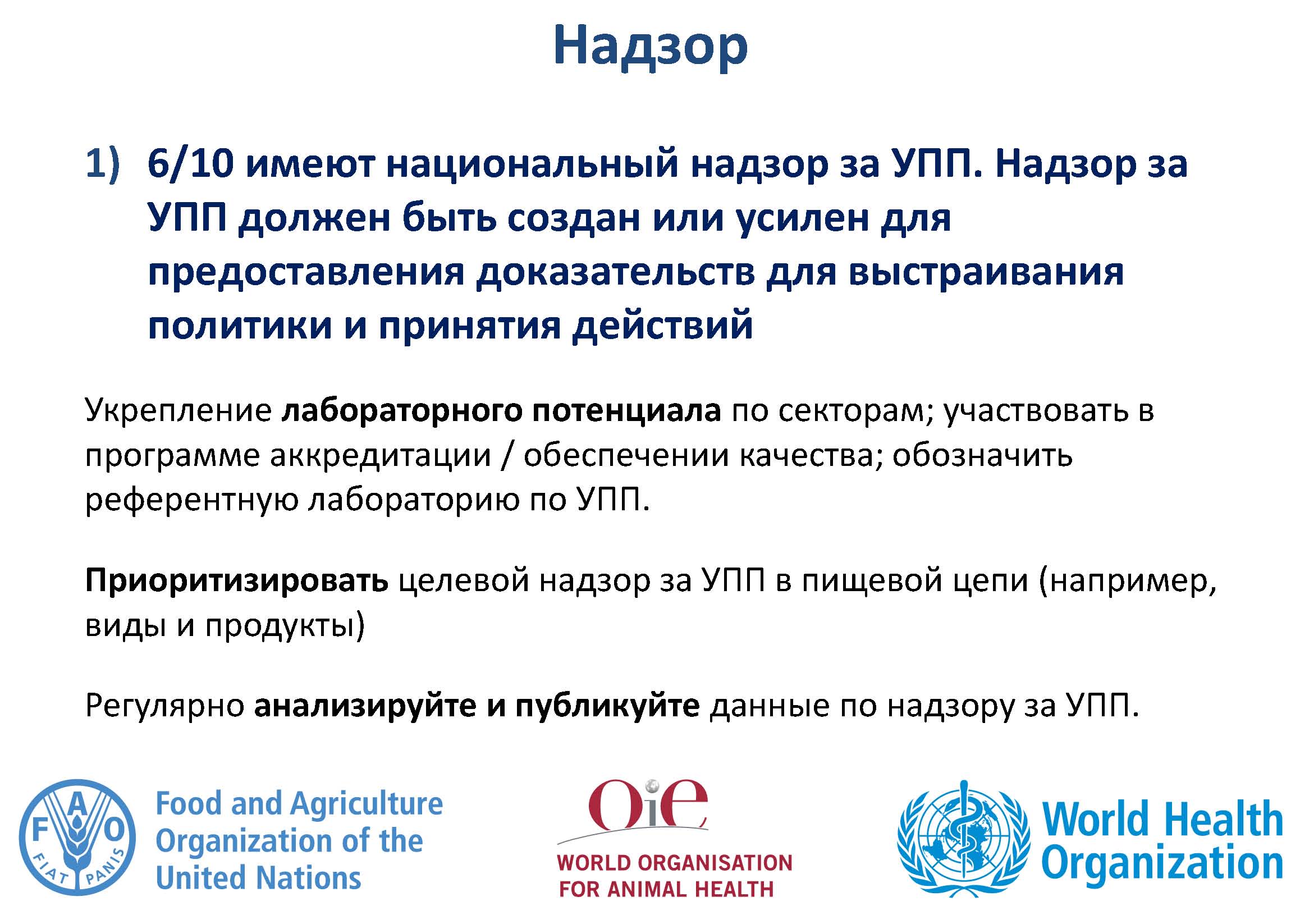 Повышение и расширение понимания и знаний об УПП требуется для привлечения национальных представителей секторов здравоохранения, сельского хозяйства и животноводства, а также для поощрения изменений в поведении. Реформы необходимы, но требуют устойчивого финансирования всех мероприятий, указанных в НПД.