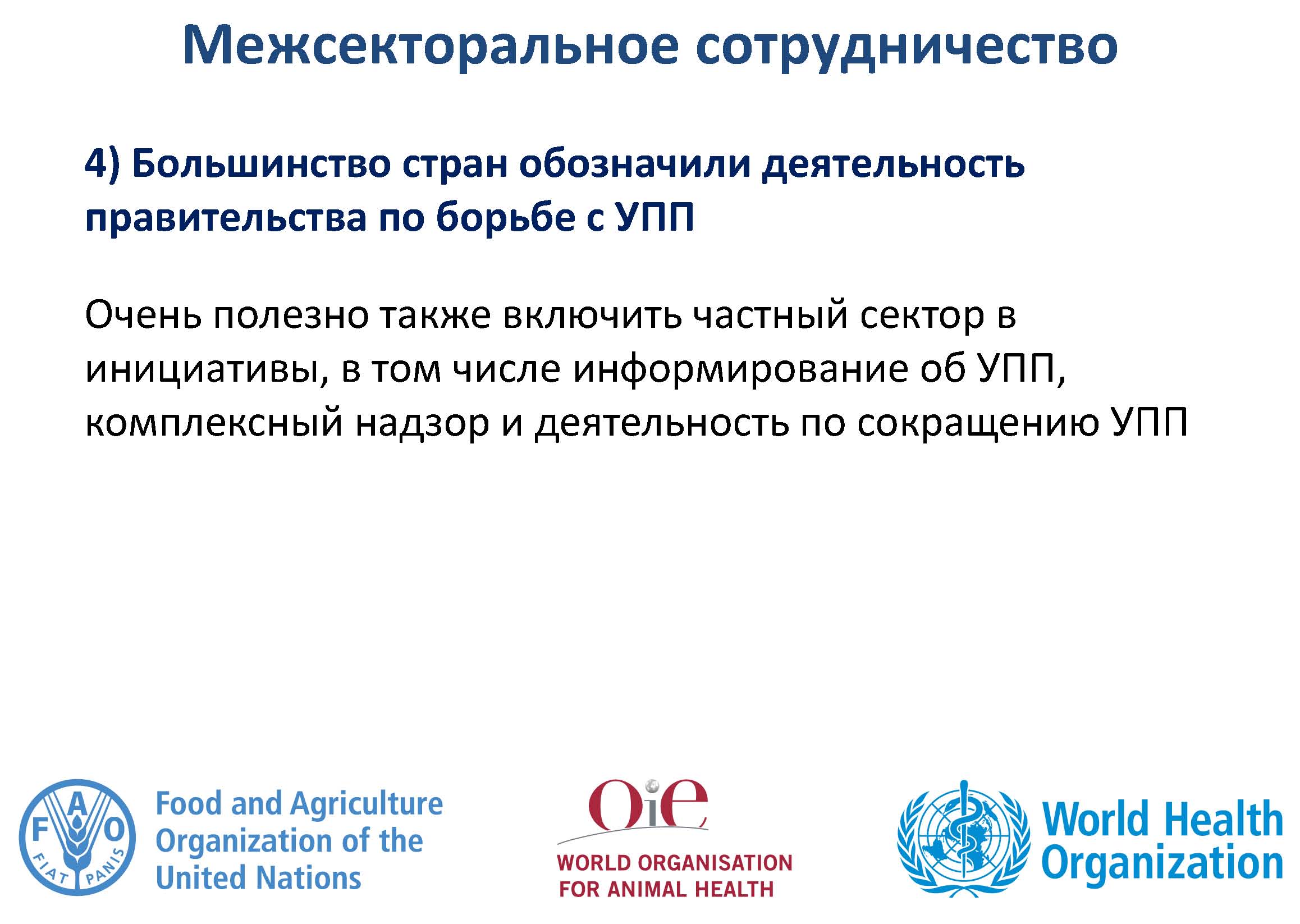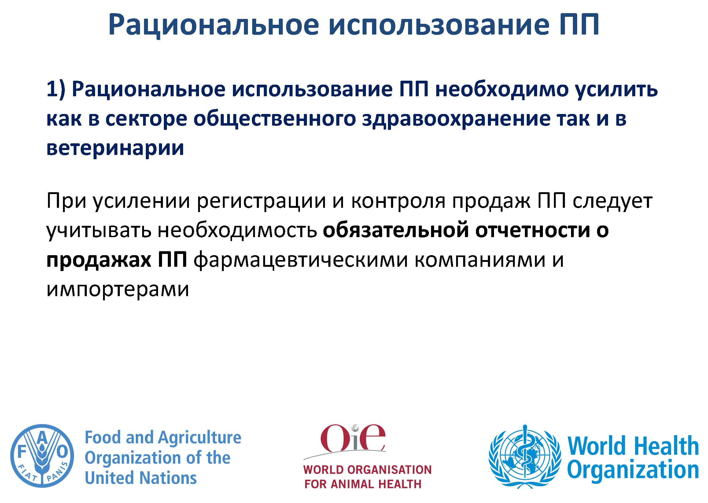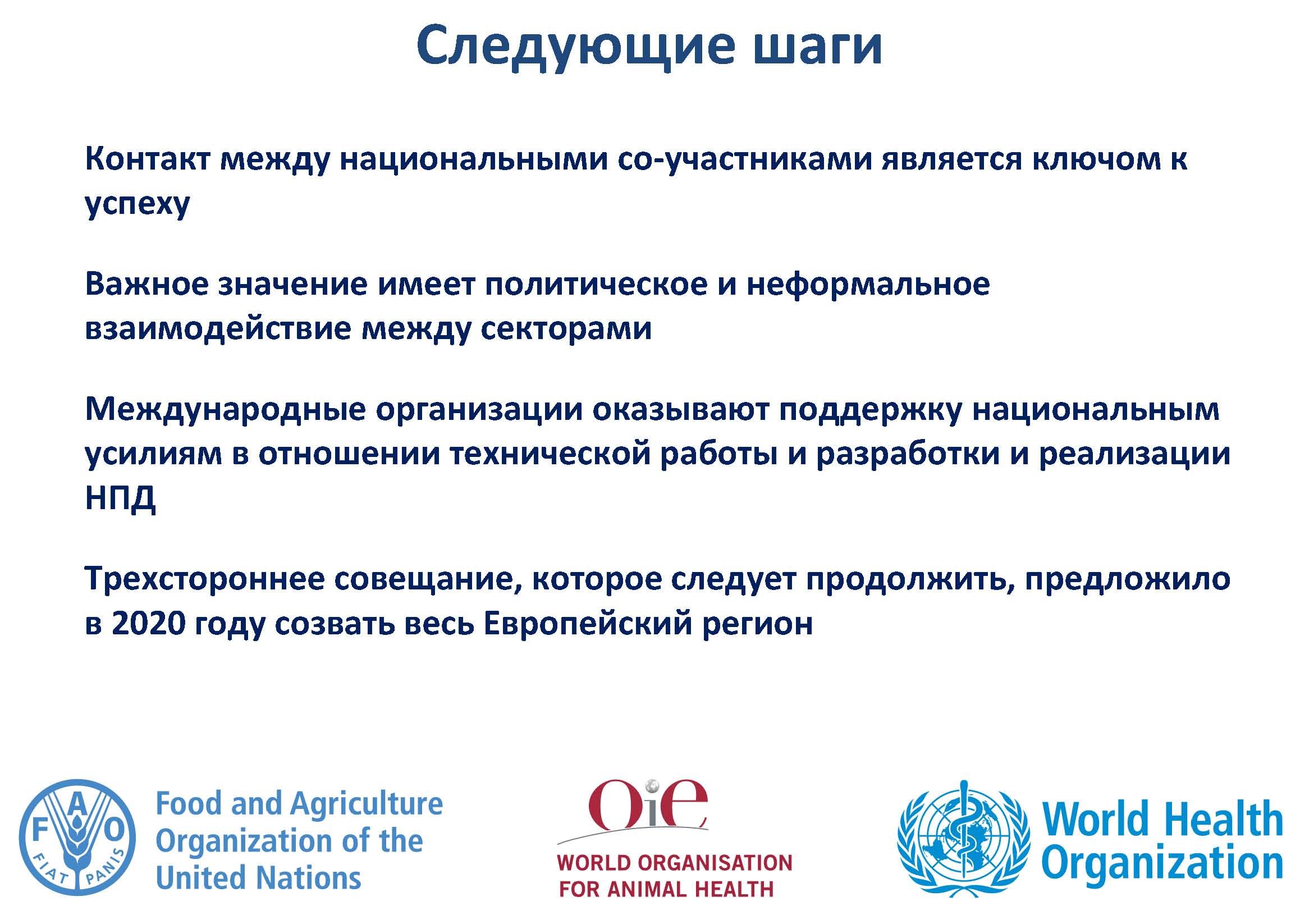 В связи с деятельностью трехстороннего альянса, страны были призваны более эффективно участвовать в сборе данных МЭБ об использовании противомикробных препаратов у животных, а также странам предложено стать активными участниками предстоящей Всемирной недели правильного использования антибиотиков (12-18 ноября 2018 г.) при участии всех секторов.
