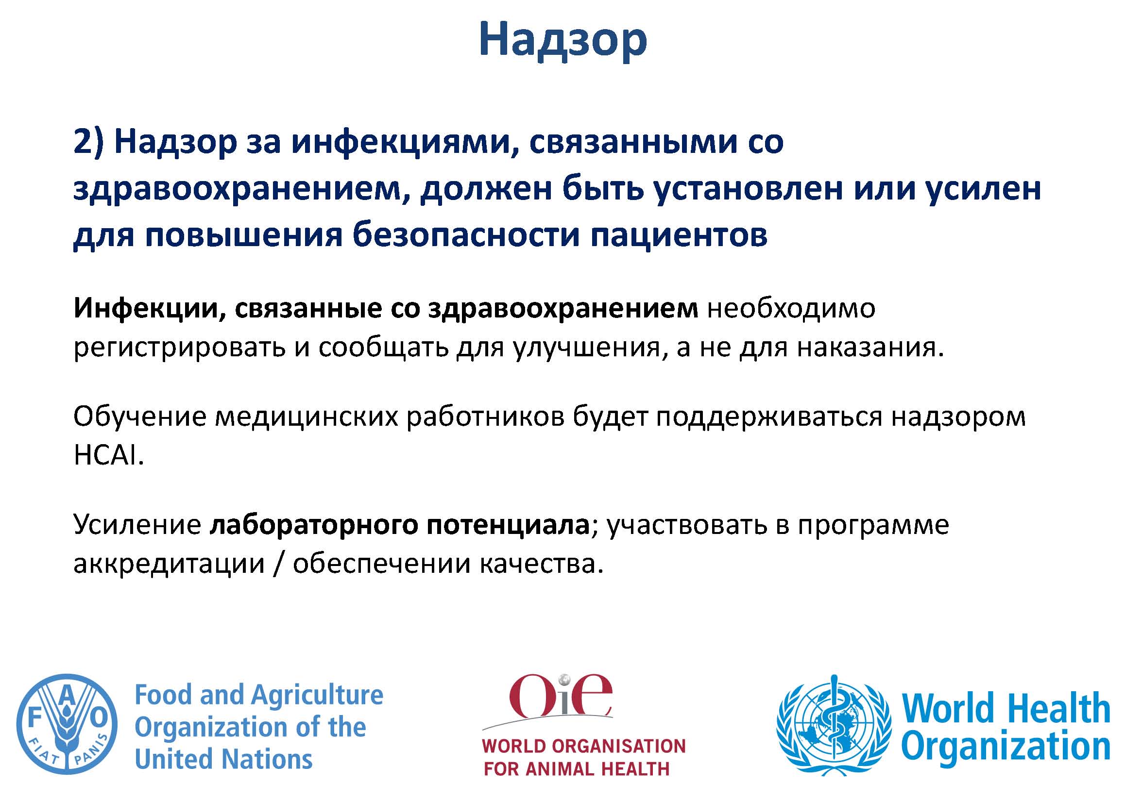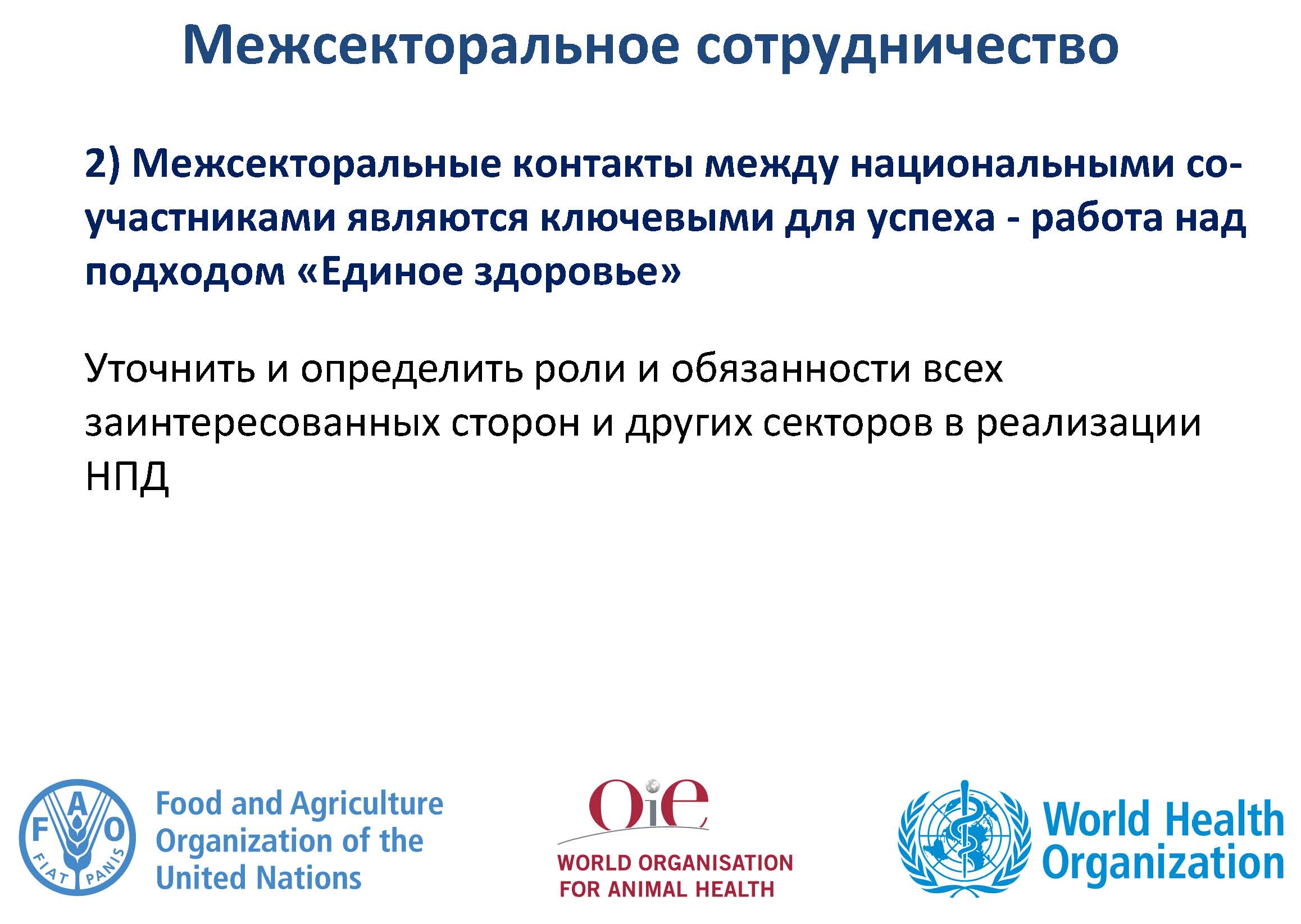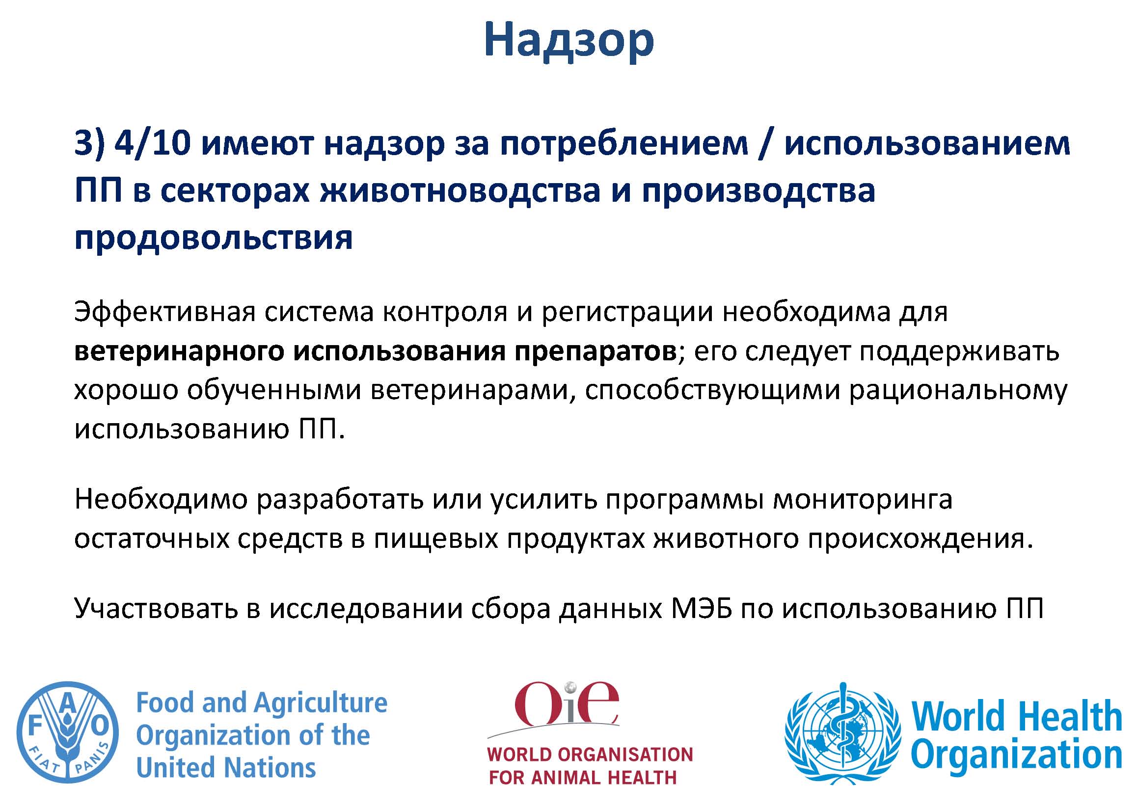 В связи с деятельностью трехстороннего альянса, страны были призваны более эффективно участвовать в сборе данных МЭБ об использовании противомикробных препаратов у животных, а также странам предложено стать активными участниками предстоящей Всемирной недели правильного использования антибиотиков (12-18 ноября 2018 г.) при участии всех секторов.